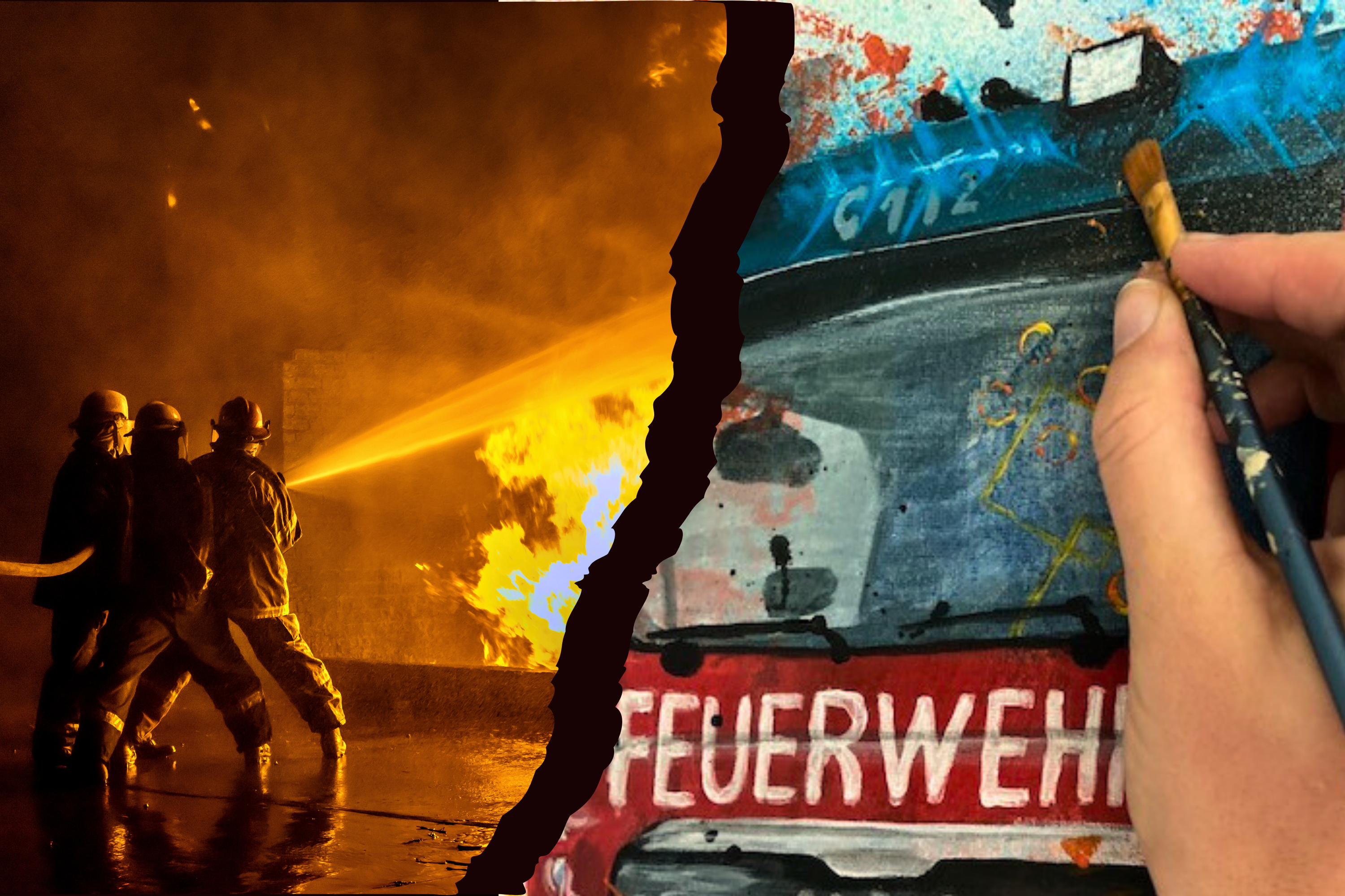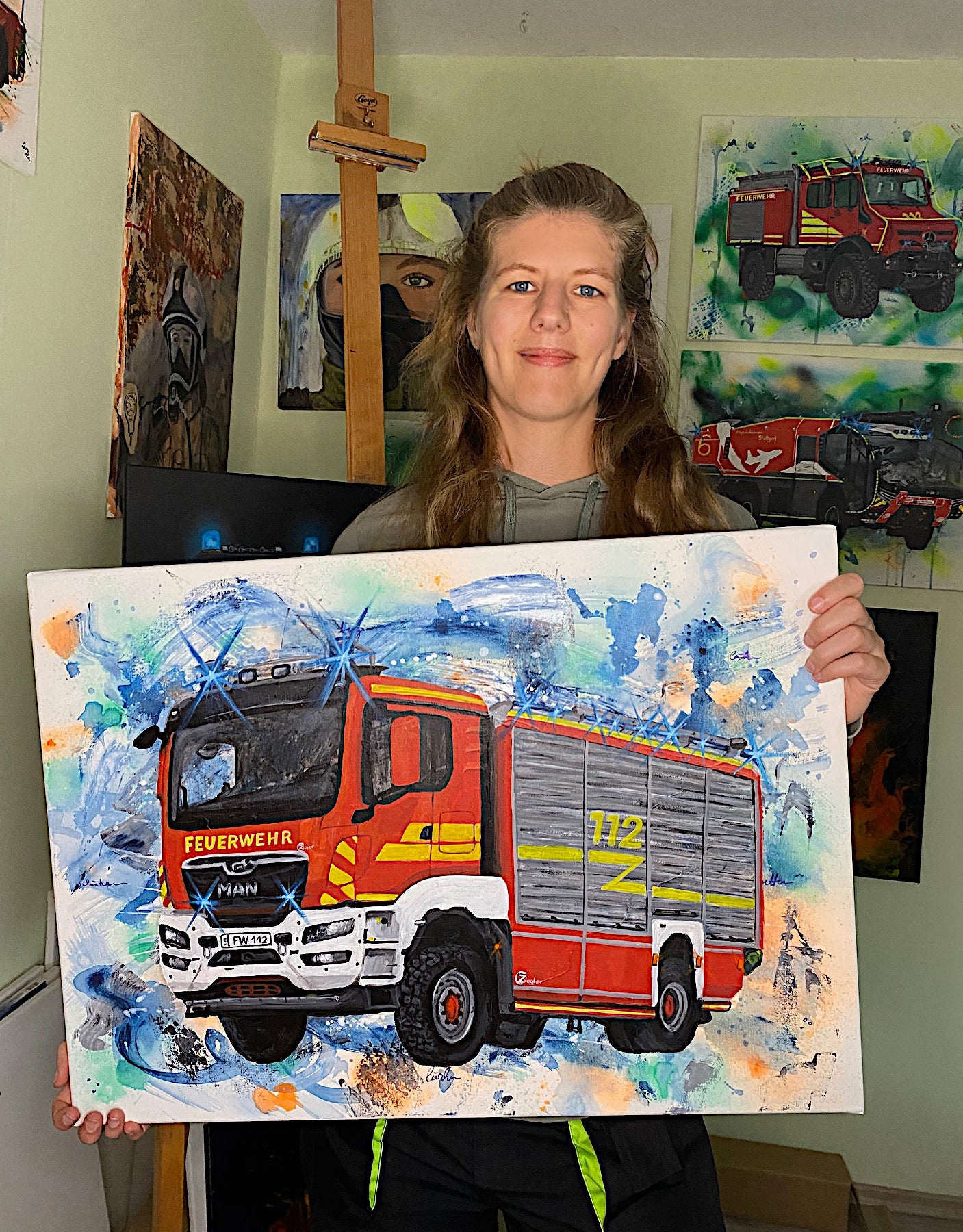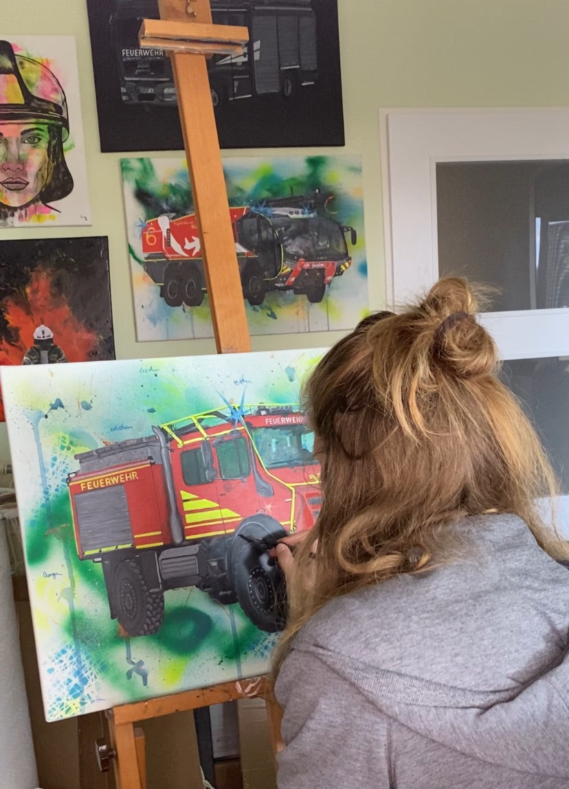 Ich bin Feuerwehrfrau und ich male. Das eine erst seit ein paar Jahren, das andere schon, seit ich einen Pinsel halten kann. Irgendwann habe ich begonnen, beide Welten zu verbinden.