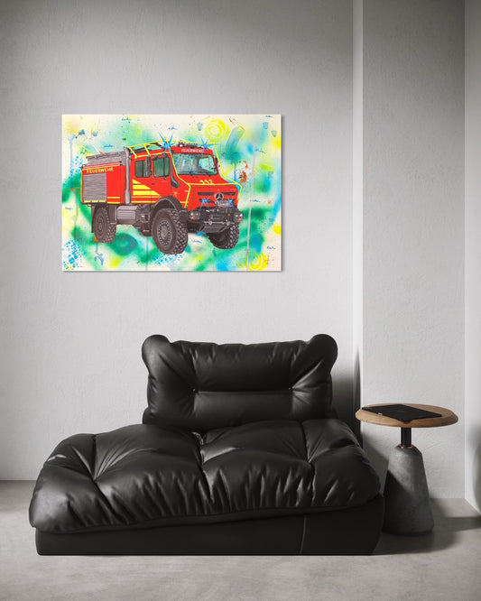 Handgemaltes Feuerwehrbild "Unimog Waldbrand"